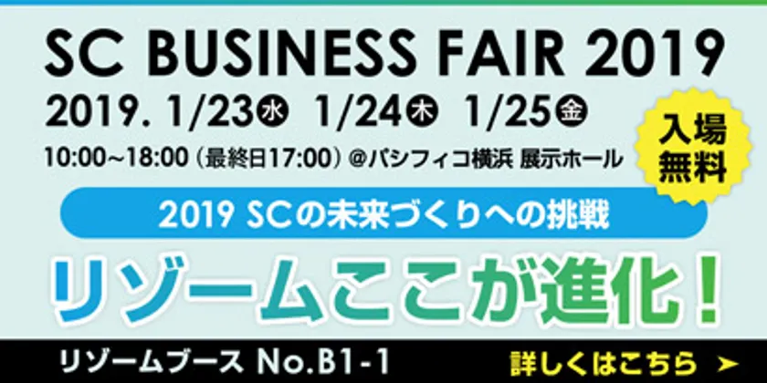 株式会社リゾーム(本社:岡山県岡山市、代表取締役:中山 博光)は、1月23日(水)から25日(金)にパシフィコ横浜(神奈川県横浜市)で開催されるSC業界唯一の商談展示会「第43回SCビジネスフェア2019」(主催:一般社団法人日本ショッピングセンター協会)に出展いたします。