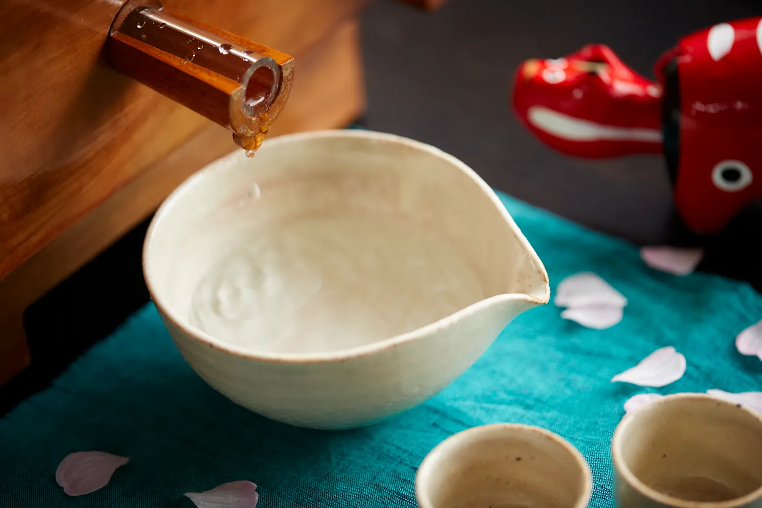 当館では、会津で張り子人形として、400年前より作られている赤べこを通して、会津文化に親しんでもらえるよう、2016年より季節ごとに赤べこをテーマにしたイベントを実施しています。2019年の春は、桜の名所が多い会津にちなみ「桜」を掛け合わせたイベント「赤べこ花見」を開催します。赤べこの設えの他に、会津民謡や地酒が花見気分を盛り上げます。会津のお祭りでは「会津磐梯山」など民謡の演奏が定番です。また、会津若松市など日本酒での乾杯を推奨する条例を策定している市町村があるほどの酒どころで、日本酒も花見の席には欠かせません。その味も高い評価を得ており、全国規模で開催される唯一の清酒鑑評会「全国新酒鑑評会」にて、福島県は金賞受賞数史上初の6年連続1位を獲得しています。