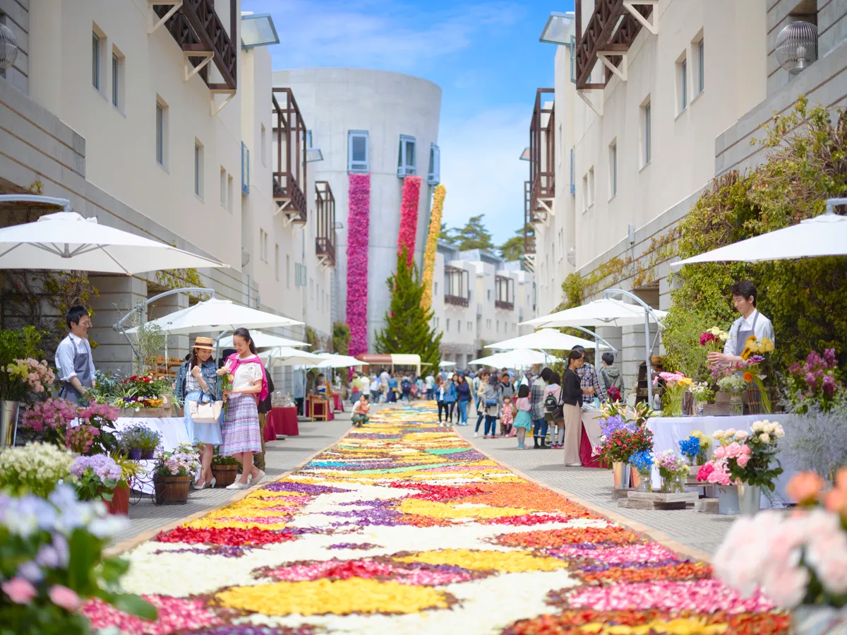 自然豊かな八ヶ岳エリアのリゾートホテル「星野リゾート リゾナーレ八ヶ岳」では、2019年4月27日~5月6日、5月11日~26日の2部構成で「花咲くリゾナーレ2019」を開催します。花咲くリゾナーレは、春の訪れを祝う毎年恒例のイベントとして2005年からスタートし、2019年で15回目を迎えます。ホテルのメインストリート「ピーマン通り」には、チューリップの花びらを敷き詰めた「花畳の回廊」や八ヶ岳で育った花を使う「花苗の回廊」に加え、新たに花をモチーフにした頭上装飾が登場し、花に囲まれた時間を過ごすことができます。また、ホテル内のプール「ilmare(イルマーレ)」やビュッフェ&グリルレストラン「YYgrill」にも花が咲き、館内のいたるところで春を感じることができます。