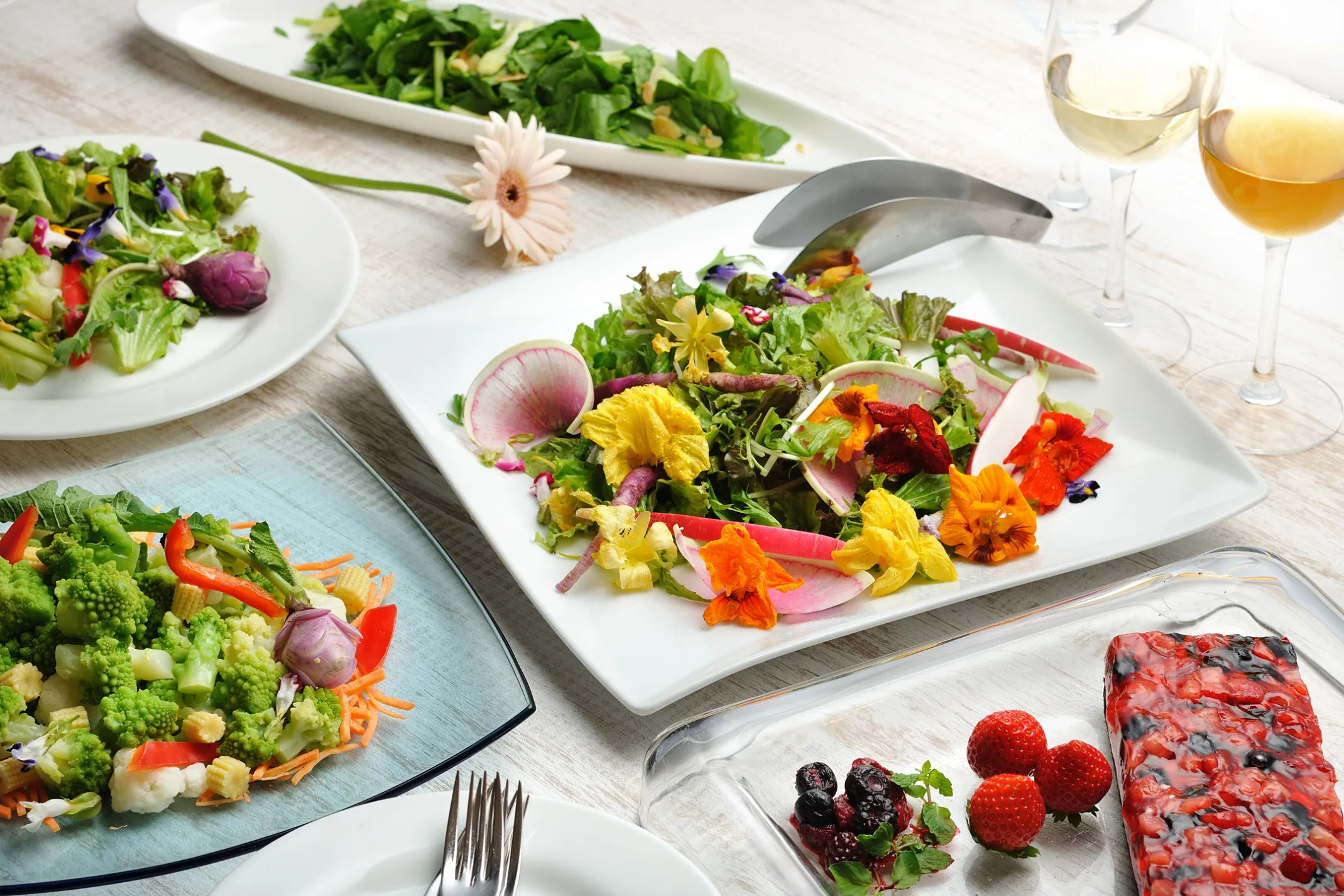 YYgrillでは、春を感じる花野菜やエディブルフラワーを使用したサラダ、桜や苺のデザート、花のフレーバーウォーターを楽しめる、春のお花畑ビュッフェを提供します。目にも鮮やかな色とりどりのメニューがビュッフェボードに並び、お花摘みをするような気持ちでランチを楽しめます。