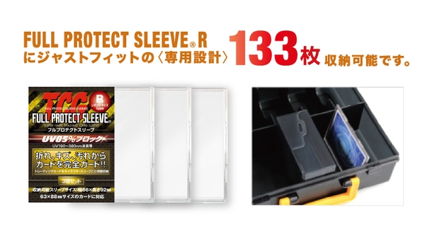 また、河島製作所の人気商品、フルプロテクトスリーブも収納可能です。トレカキャリングケースは、トレーディングカードも、デッキケースもフルプロテクトスリーブも多彩に収納できるアイテムです。