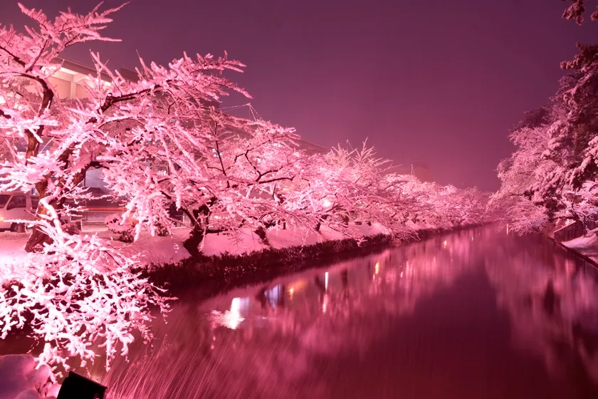 冬期間、桜の枝に積もった雪にピンク色のライトアップをすることで、まるで満開の桜が咲いているように見える幻想的な光景を楽しめます。