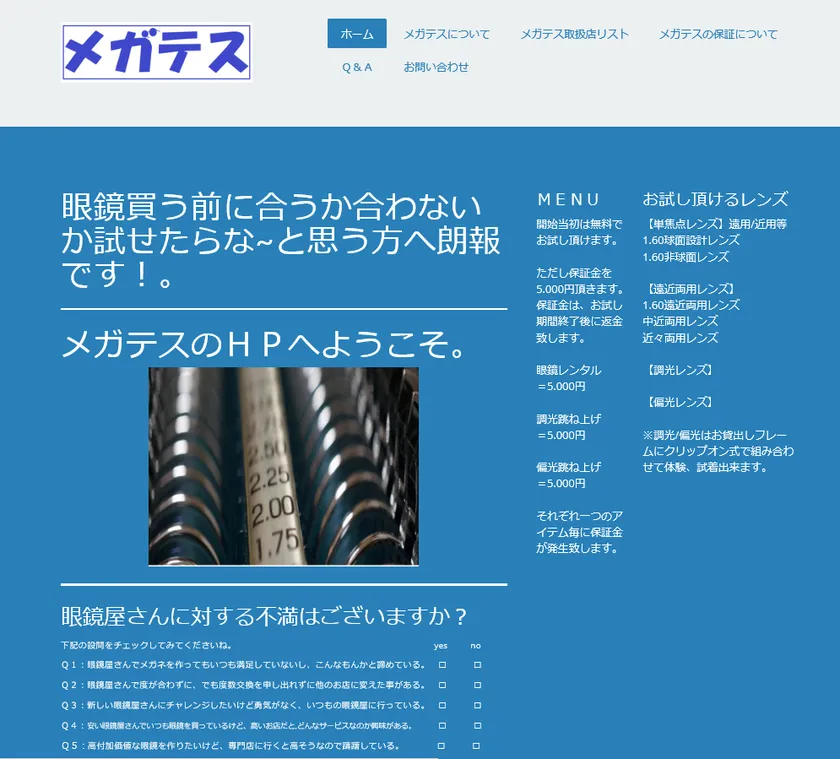 中小零細の眼鏡店が集った MORE~快適眼鏡研究会~のメンバーが新サービス開始、 買わないとそのお店の眼鏡の技術レベルが 分からないという消費者の不満に応え、 買わずに試食するかのように、 そのお店のサービスやレンズの見え心地を体感できる 「メガテス無料30日間レンタルサービス」を始めました。