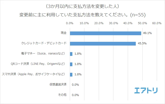 直近3か月以内に支払方法を変更した人に対し、変更前にメインとして利用していた支払方法を聞いたところ約半数の人が「現金」(49.1%)と回答しました。