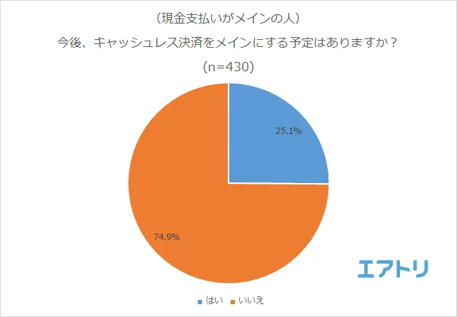 普段の支払い方法のメインが現金の人に、今後、キャッシュレス決済をメインにする予定はあるか聞いたところ、約4人に1人が「はい」(25.1%)と回答しました。