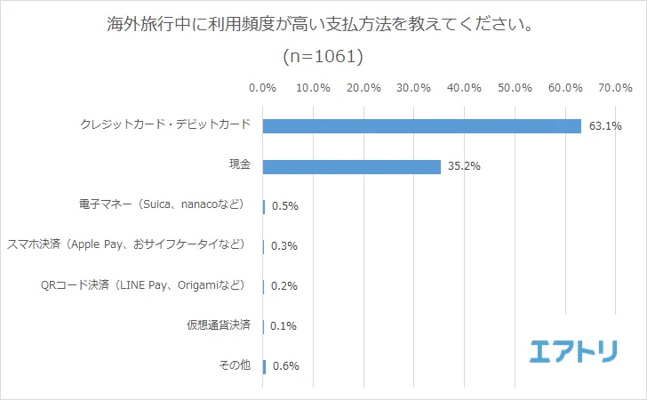 海外旅行中に利用頻度が高い支払方法を聞いたところ、「クレジットカード・デビットカード」(63.1%)と回答した人が最も多い結果となりました。「現金」と回答した人は35.2%にとどまり、普段よりも海外旅行中の方がキャッシュレス派の人が多いことが分かりました。