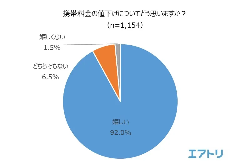 「嬉しい」(92.0%)と、9割以上の人が携帯料金の値下げが検討されていることを歓迎する回答結果となりました。