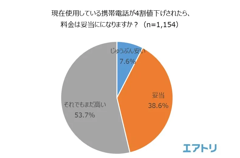 「じゅうぶん安い」(7.6%)、「妥当」(38.6%)、「それでもまだ高い」(53.7%)と、半数以上の人が、“値下げされたとしてもまだ料金を高く感じる”と回答する結果となりました。