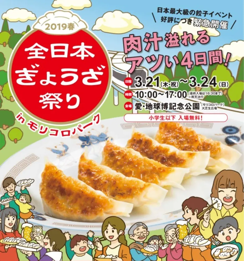 全日本ぎょうざ祭り実行委員会は、毎年10万人以上の来場者でにぎわう、GWのフードフェス「全日本うまいもの祭り」によるスピンアウト特別催事「全日本ぎょうざ祭り」を2019年3月21日(木・祝)~3月24日(日)に、愛知県長久手市の愛・地球博記念公園(モリコロパーク)で開催することを決定いたしました。