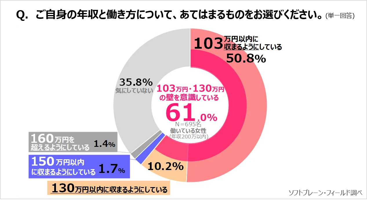 ・2018年1月の配偶者控除の年収要件が103万円から150万円に拡大後、初年度の働き方について、「年収103万円以内に収まるようにしている」が50.8%で最多。「年収150万円以内に収まるようにしている」はわずか1.7%。