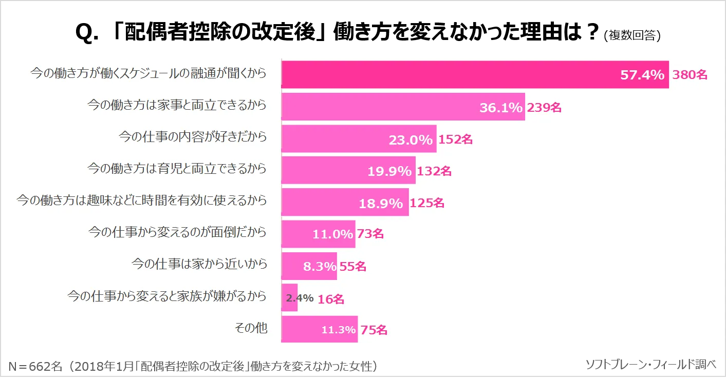 働き方を変えなかった方(662名)の理由については、働く時間など「スケジュールの融通が利くから」が57.4%でもっとも多く、「家事と両立できるから」の36.1%、「仕事内容が好きだから」23.0%に20ポイント以上差をつける結果となりました。