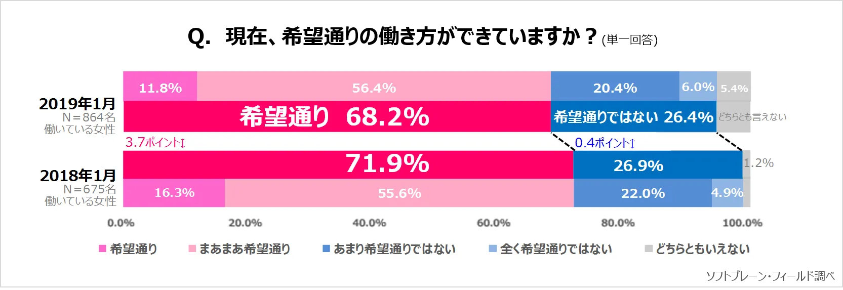 現在、希望通りの働き方が「できている」が、68.2%となり、前回調査時の71.9%を若干下回る結果となりましたが、約7割近くの方が、希望通りの働き方ができていると回答しました。一方で、希望通りの働き方が「できていない」が26.4%となり、理由については、「希望する職種についていないから」が32.0%でもっとも多く、「家族や周りの人のサポートが少ないから」が16.0%、「育児が忙しいから」が11.6%と続きました。希望通りの働き方をするために、今の状況に満足せず仕事をしながらも、「出会いと経験を増やし希望の仕事に出会えるように固定観念を持たず行動するように努力している(40代)」や、「仕事の幅を広げ、スキルアップのために簿記の勉強している。(40代)」といった意欲的な声もみられました。