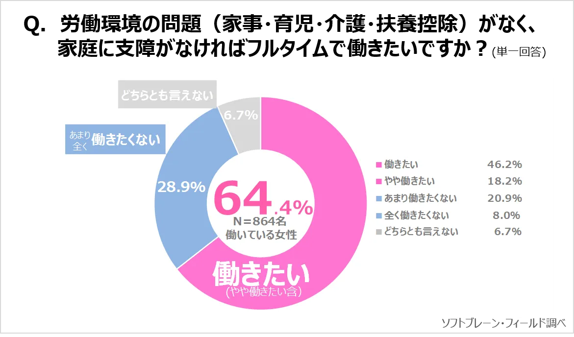 次に、労働環境の問題(家事・育児・介護・扶養控除等)がない場合に、フルタイムで働きたいと考えるか調査をしました。