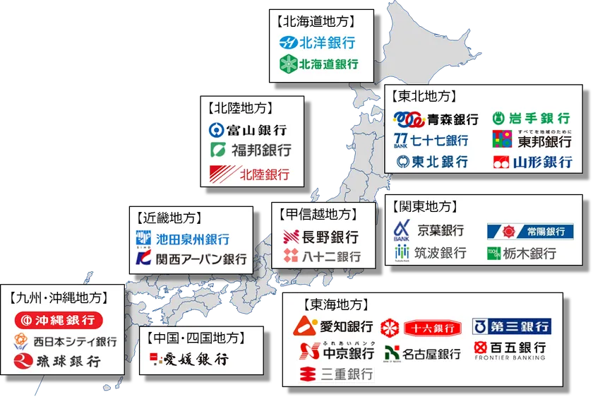 愛知銀行、青森銀行、池田泉州銀行、岩手銀行、愛媛銀行、沖縄銀行、関西アーバン銀行、京葉銀行、七十七銀行、十六銀行、常陽銀行、第三銀行、中京銀行、筑波銀行、東邦銀行、東北銀行、栃木銀行、富山銀行、長野銀行、名古屋銀行、西日本シティ銀行、八十二銀行、百五銀行、福邦銀行、北洋銀行、北陸銀行、北海道銀行、三重銀行、山形銀行、琉球銀行(五十音順)
