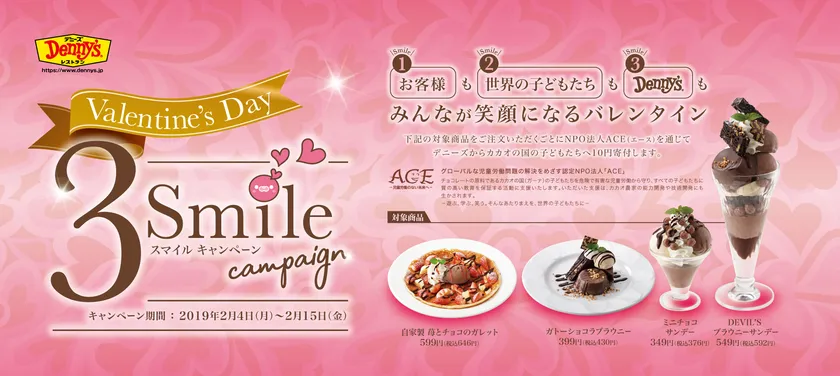 デニーズ(株式会社セブン&アイ・フードシステムズ 東京都千代田区二番町8-8)では、2019年2月4日(月)~2月15日(金)の期間中、カカオの国の子どもたちを児童労働から守る活動を行うNPO「ACE(エース)」を通じて、対象のチョコデザートを1食ご注文いただくごとに、10円を寄付する「バレンタイン・スリースマイルキャンペーン」を実施いたします。