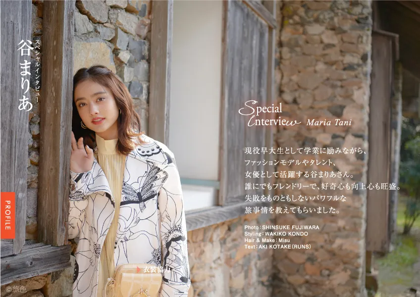 現役の早大生として学業に励みながら、ファッション誌の専属モデルやタレント、女優としても活躍する谷まりあさん。インスタグラムに投稿している日常の風景や、旅先での写真がお洒落で人気がある谷さんですが、旅のスタイルは「自由でマイペース」だそう。タイのサムイ島でゾウに乗ったお話や、リップを何色も持っていくという旅の荷物についてなど、谷さんらしい、パワフルでフレッシュな旅のお話をたくさん語ってくれました。