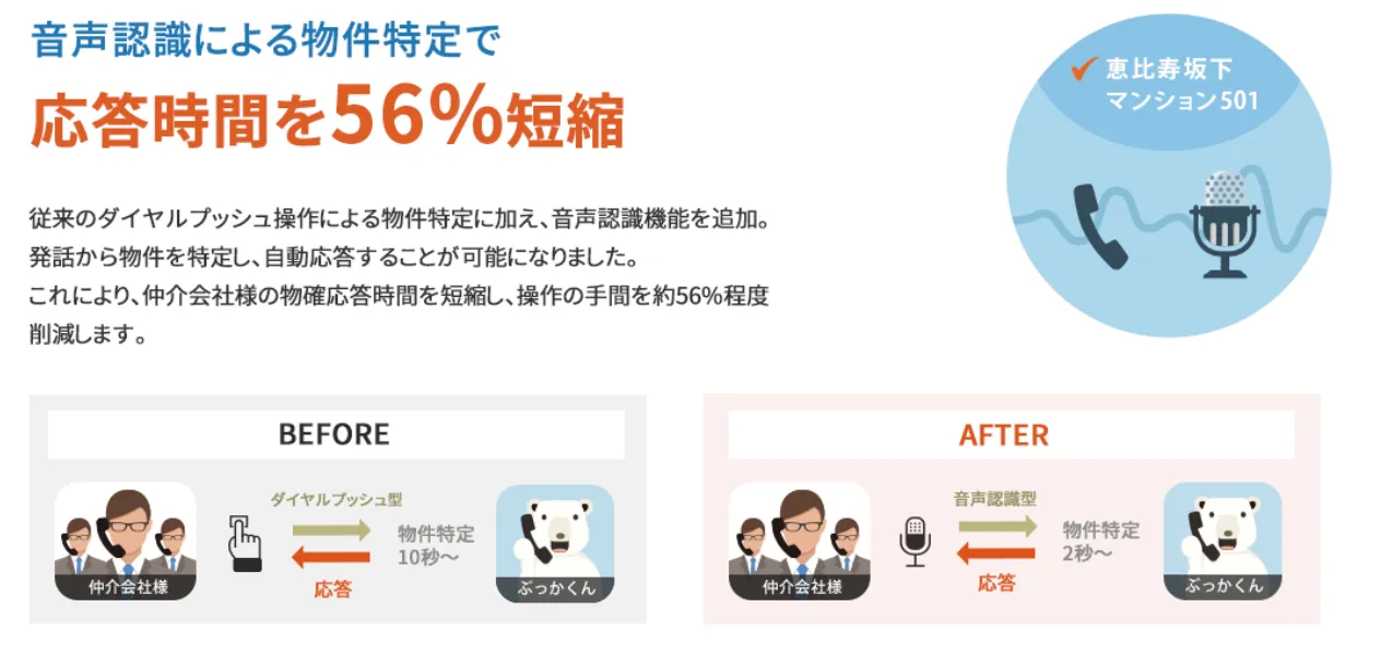 「ぶっかくん」ではこれまで、ダイヤルのプッシュ操作により物件を特定して自動応答するサービスを採用してきましたが、音声認識を実装することで従来の応答時間からさらに56%短縮し、またデバイス操作の苦手な方や外出先にいる方でも手軽に操作できるようになります。