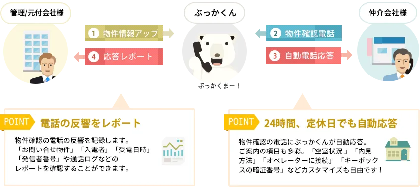 「ぶっかくん」とは、仲介会社からの物件確認や物件情報に関する電話に自動応答するシステムです。旧来の不動産賃貸業界では、仲介会社が管理会社に直接電話をして空室状況や物件情報を確認しておりました。「ぶっかくん」は、自動応答サービスにより、電話対応にかかるコストの約70%、対応時間の約56%を削減いたします。また、昨年11月には、移動の多い不動産業者の業務スタイルに即した「ぶっかくん」アプリもリリースしております。