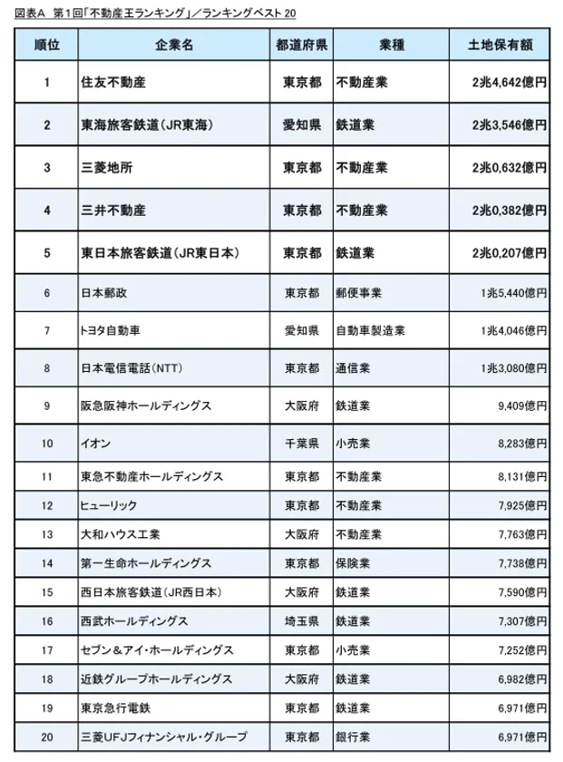 不動産王ランキングは「住友不動産」が1位、「東海旅客鉄道(JR東海)」が2位、「三菱地所」が3位、「三井不動産」が4位、「東日本旅客鉄道(JR東日本)」が5位と続き、鉄道業と不動産業の2業種が大半を占める結果となりました。