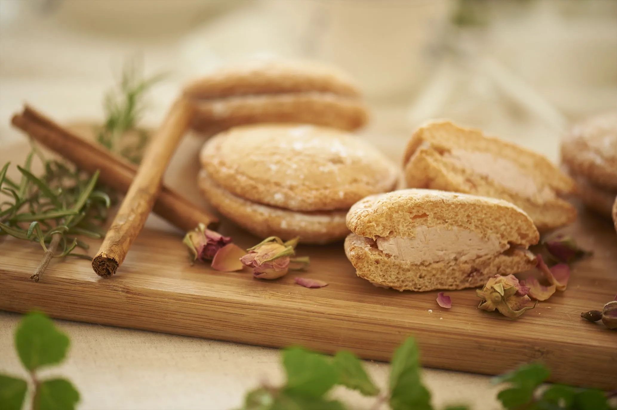 パティシエが一つ一つ手仕事で焼き上げるブッセ。表面はさっくり、中はふんわりとした軽い口あたりの焼き菓子です。ローズが香るクリームをサンドし、上品なローズの香りが口の中に広がります。10個入りでお届けします。