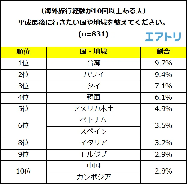 1位から「台湾」(9.7%)、「ハワイ」(9.4%)、「タイ」(7.1%)となり、順番は異なりますが平成に行って最も良かった海外旅行先の上位3位と同じ国が選ばれました。これらを選んだ理由として、暖かい気候や食事がおいしかったと挙げる意見が目立ちました。