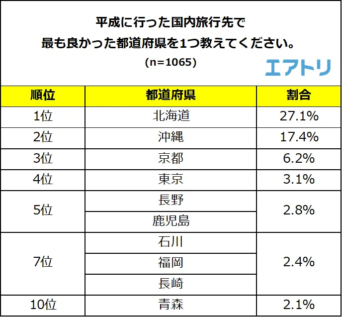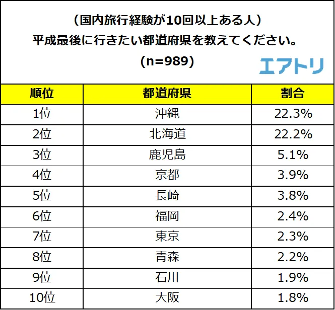 1位は「沖縄」(22.3%)、2位は「北海道」(22.2%)と平成に行って最も良かった国内旅行先の上位2位が逆転する形となりました。3位には大河ドラマなどで注目度が高まっている「鹿児島」(5.1%)が選ばれました。