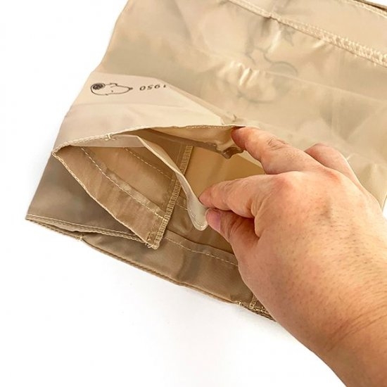 最下部にある心材に添って、クルクルっとたたんでいくだけでOK。あとは両端のスナップボタンを合わせるように2つに折りたたんでパチっと留めればコンパクトサイズになるんです。