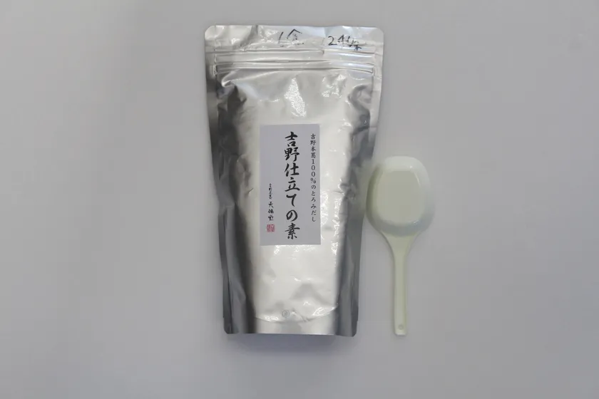 お店では昆布とかつおで一番だしをとり、味付けをしたうどんだしに、注文が入るたび水溶き葛粉を入れて葛あんを作っていますが、ご自宅でも簡単に「吉野うどん」を作っていただけるように、粉末だしに吉野本葛を混ぜた粉末和風とろみだしの素をご用意しました。