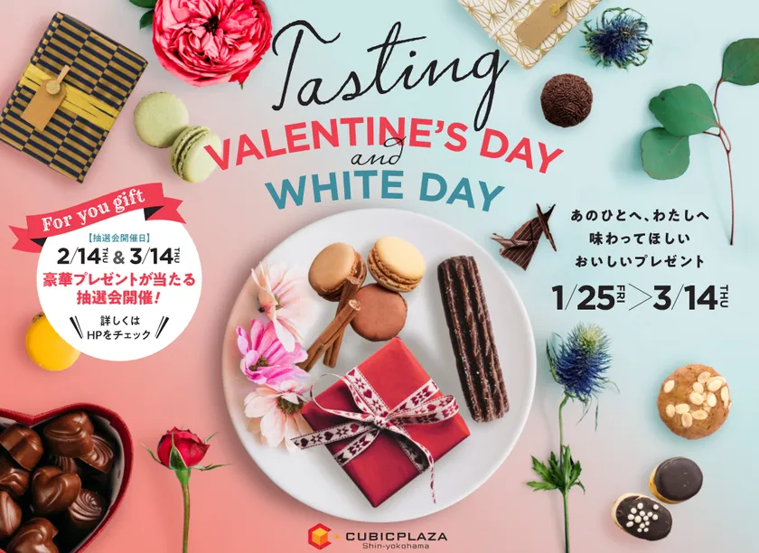 また、2月14日(木)バレンタインデー・3月14日(木)ホワイトデーの各当日は、“素敵な商品が当たる抽選会”を開催!館内各店舗にて税込1,000円以上ご利用のレシートでご参加いただけます。更にキュービックプラザ新横浜のホームページの対象画面を提示いただくとダブルチャンスも!奮ってご参加ください。