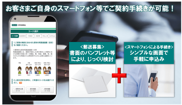 三井住友海上が提供する、お客さまが紙の保険申込書を参照しながら、ご自身のスマートフォン等で契約手続きを行うシステムです。