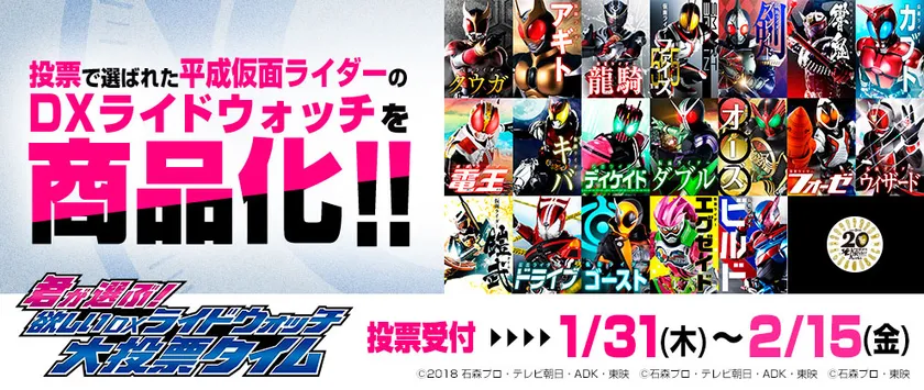 株式会社バンダイ ボーイズ事業部では、現在放送中の「仮面ライダージオウ」に登場する変身キーアイテム「ライドウォッチ」について、平成仮面ライダー20作品を記念して、投票で選ばれた平成仮面ライダー5人を商品化する『君が選ぶ!欲しいDXライドウォッチ大投票タイム』の投票受付を、2019年1月31日(木)11:00より開始いたします。