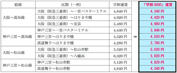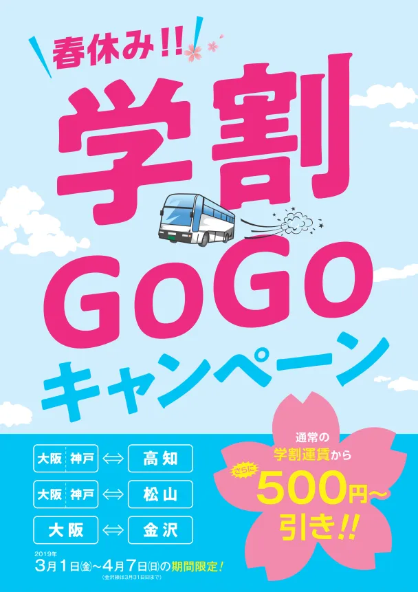 阪急バス株式会社、神姫バス株式会社、とさでん交通株式会社、伊予鉄バス株式会社及び北鉄金沢バス株式会社は、阪神~高知・松山・金沢間を移動されるすべての学生の皆様が、もっと気軽に高速バスをご利用いただけるよう、学割運賃よりさらにお得な運賃でご利用いただける「春休み!学割GOGOキャンペーン」を実施いたします。この機会に、便利な高速バスをぜひご利用ください。