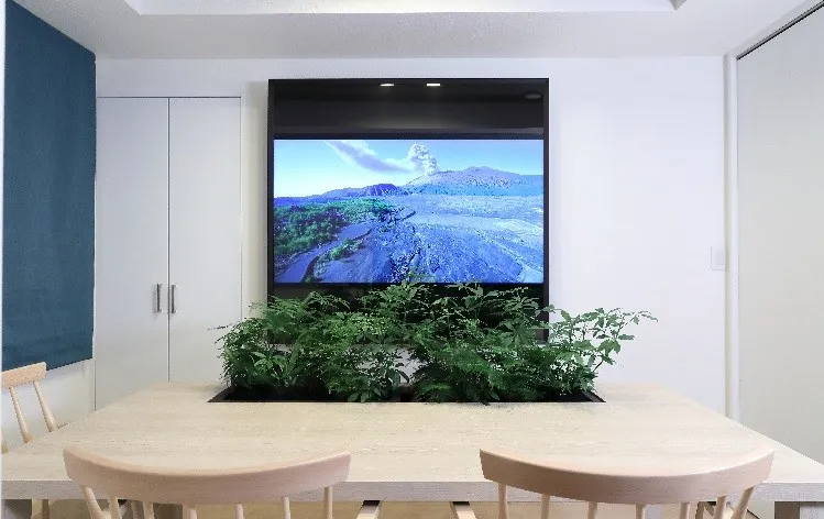 「COMORE BIZ」のノウハウと、三井デザインテック社の住空間コーディネートのノウハウを組み合わせて住宅に導入し、生活しながら自然に緑が視界に入るように家具を配置することで、人に最適な自然環境に近づけ、ストレス軽減につながる最適な緑視率を実現しました。またストレス軽減の効果があるハイレゾリューション音源を「Ambient Media Player(アンビエントメディアプレーヤー)」(※4)で提供。絵画の額縁のような新しいディスプレイと人間の可聴範囲を超えた豊かな高周波成分を含む音源で、その空間で過ごすだけでストレス軽減を促すリビングダイニングを提案します。