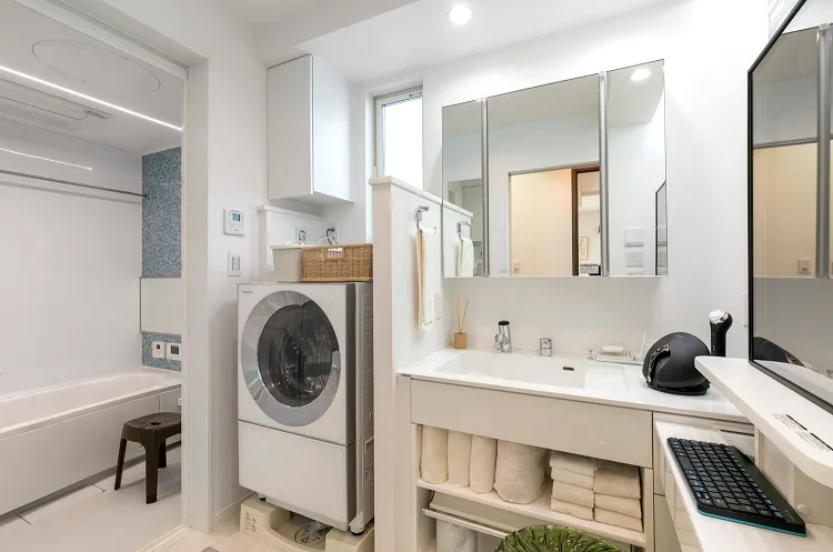 洗面空間は、「広さ」「収納量」「空調」に関する不満(※7)を解消する設計としました。洗面所内の床暖房で快適な温度環境を実現し、さらにL型の洗面カウンターにより家族が同時に洗面室を使用でき、収納量を確保するとともに、フットケア用のスタンドを設置。また、窓と鏡位置を調整することで、自然光が洗面室内に入る明るい空間設計となっています。宿泊体験時には、カウンセリング商品の「Panasonic Beauty PREMIUM(パナソニックビューティプレミアム)」(※8)シリーズの美容家電も体験いただけます。