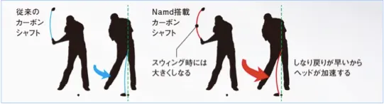新次元カーボン「Namd」はシャフトのカーボン繊維と樹脂の界面密着力を飛躍的に向上させた高い強度と軽さが特徴。大きくしなりながら素早く戻る、かつてない球押し感でボール初速アップを実現します。