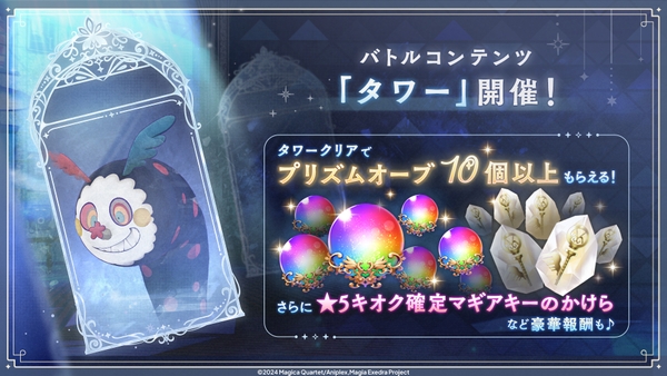 6月6日(金)12:00より、期間限定バトルコンテンツ「タワー」を開催いたします。タワーとは、各鏡層のボスと戦うバトルコンテンツです。タワークリアで「プリズムオーブ」10個以上や、「★5キオク確定マギアキーのかけら」などの報酬も獲得することができます。