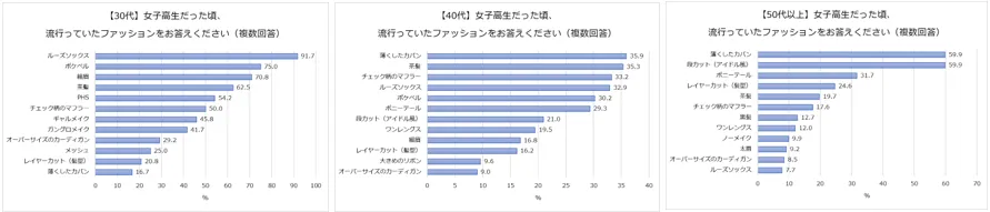 自分が女子高生だった頃に流行っていたファッションは、30代が1位「ルーズソックス」(91.7%)、2位「ポケベル」(75.0%)、3位「細眉」(70.8%)であったのに対し、40代の女性の1位は「薄くしたカバン」(35.9%)2位「茶髪」(35.3%)、3位「チェック柄のマフラー」(33.2%)、50代以上の女性は、同率1位に「薄くしたカバン」・「段カット」(59.9%)、3位「ポニーテール」(31.7%)がランクインする結果になりました。世代によって当時流行っていたファッションに違いが出ました。