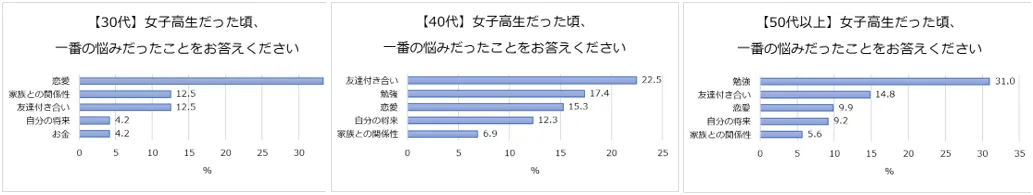 先ほどの調査で女子高生の頃どのようなことに時間を使っていたかについて、世代別に違いが出るという実態が明らかになりましたが、どのようなことに悩んでいたのかについても30代と50代以上では、大きな差がありました。30代では最も多かったのが「恋愛(33.3%)」であったのに比べ、50代以上の方は「勉強(31.0%)」でした。