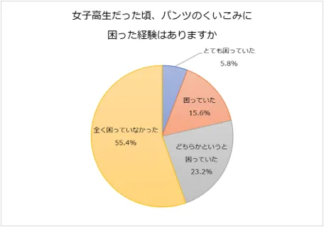 そこで、30~60代の女性にも女子高生当時にパンツのくいこみに困った経験があるかどうかを調査しました。すると、「困っていた」(とても困っていた・困っていた・どちらかというと困っていた)と回答した人が44.6%おり、世代別に見ても、「困っていた」と回答した人は4割以上でした。どの世代でも、PK現象は問題になっているようです。