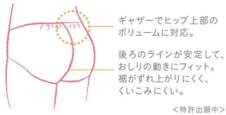 ワコール人間科学研究所の研究によると、ティーンはからだの成長によってヒップから臀溝(※1)にかけてボリュームがでるため、ショーツの縦方向の伸びが足りないと裾がずれ上がりやすくなり、しゃがんだり座ったりすることで臀裂(※2)が開くと、内側にくいこんでしまいます。『non! PK』はティーンのヒップに合わせたふくらみをもち、縦方向への十分な伸びを確保する構造と、動作時の臀裂の開きに追随する構造によって、動くティーンのヒップにフィットし、裾がずれあがりにくく、くいこみにくいショーツとなっています。(特許出願中)