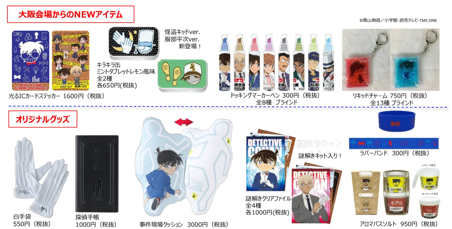 大阪会場では「光るICカードステッカー」や大人気「キラキラ缶ミントタブレットレモン風味」の服部平次・怪盗キッドバージョンをはじめ、青山剛昌先生描き下ろしの「複製ミニサイン色紙」付きガイドブック、白手袋や捜査手帳など本展オリジナルアイテムが多数会場に登場します!