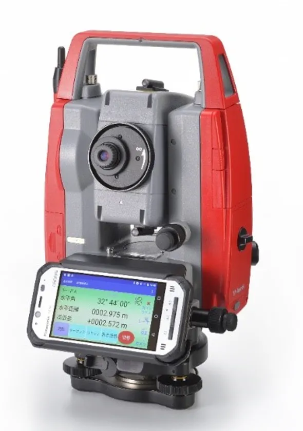トータルステーションは、測量や土木建築の現場に欠かせない計測機器です。内蔵の望遠鏡を覗いて任意の地点にピントを合わせることで、設置地点からの距離と角度を極めて高い精度で計測できます。もともと別々の機器であった距離を測る光波測距儀(EDM)と角度を測るセオドライトを一体化し、必要な計測データをトータルに取得できることから、「トータルステーション」と呼ばれています。