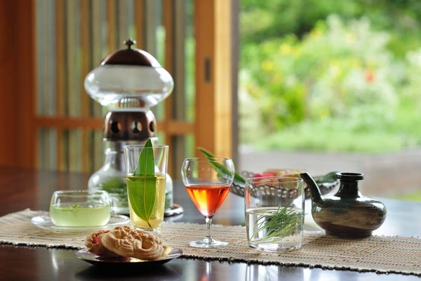完成した菓子は、ゆがふキッチン内のプライベートダイニングで味わいます。出来立ての琉球菓子3種に加えて、ちいるんこうや冬瓜漬けなどの数種類の琉球菓子を、螺鈿細工が鮮やかな伝統的な琉球漆器に盛り込みます。今年はシナモンのような香りの「カラキ」や真っ赤な色合いが鮮やかな「アカバナー」などのキッチンガーデンで摘んだばかりのハーブを使ったお茶に、泡盛を併せた茶酒を楽しみます。緑豊かなキッチンガーデンを望む空間で、贅沢な午後のひとときを過ごせます。