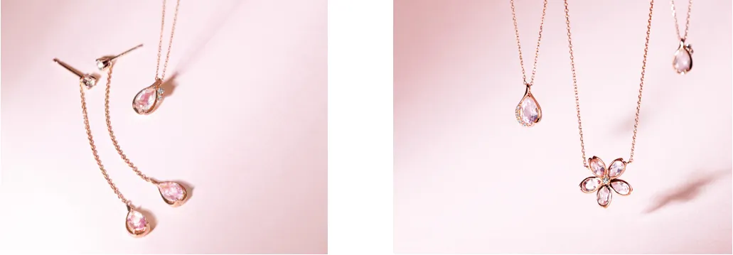 本コレクションは、春を彩る桜とその花びらをモチーフにしたシリーズです。桜のやさしい印象にぴったりなローズクォーツを一枚、一枚の花びらにあしらいました。ローズクォーツは「美・愛・優しさ」を象徴する石であり、身につけた女性をやさしいオーラで包みこみ、内面の美しさを輝かせてくれるといわれています。ハートやしずくをモチーフにした限定デザインも登場しますので、是非ご注目ください。