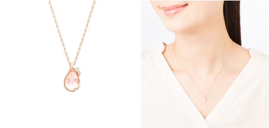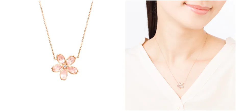 アメシストやモルガナイトなどの天然石をあしらった、瑞々しさを感じるしずくモチーフや愛の象徴でもあるハートのモチーフ。その他、桜のかたちを表現したキュービックジルコニアのネックレスや、マイクロスコープでのぞくと桜のカットが施された上質なダイヤモンドのプラチナネックレスなど幅広いラインを揃えております。
