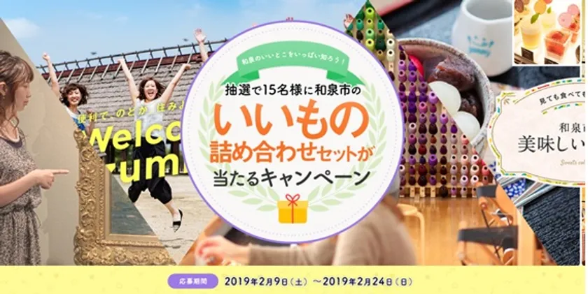 和泉市は、2月9日(土)より、和泉市観光情報サイト「SATOMACHIIZUMI(サトマチイズミ)」にて、指定のページをご覧いただき、応募すると、抽選で15名様に、和泉市のいいもの詰め合わせセットが当たる、期間限定のキャンペーンを実施いたします。