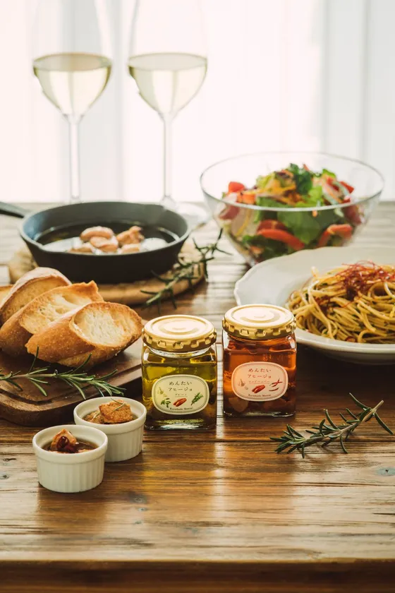 今回、特殊な加熱法を施した明太子をスペイン産のピュアオリーブオイルに漬け込むことで、明太子の粒感とスパイスの香りを贅沢に閉じ込めた「めんたいアヒージョ」が完成しました。