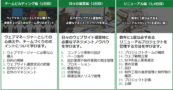 ① テクニカルな知識や手法だけではなく「ウェブサイト運営のマネジメントのコツ」が学べます
