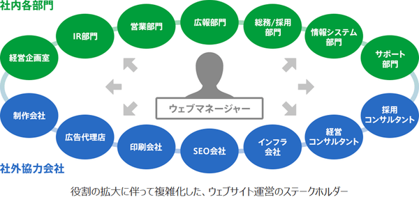 ウェブサイトの役割が拡大したことにともともない、ウェブサイト運営に関与する部門は複雑になりました。