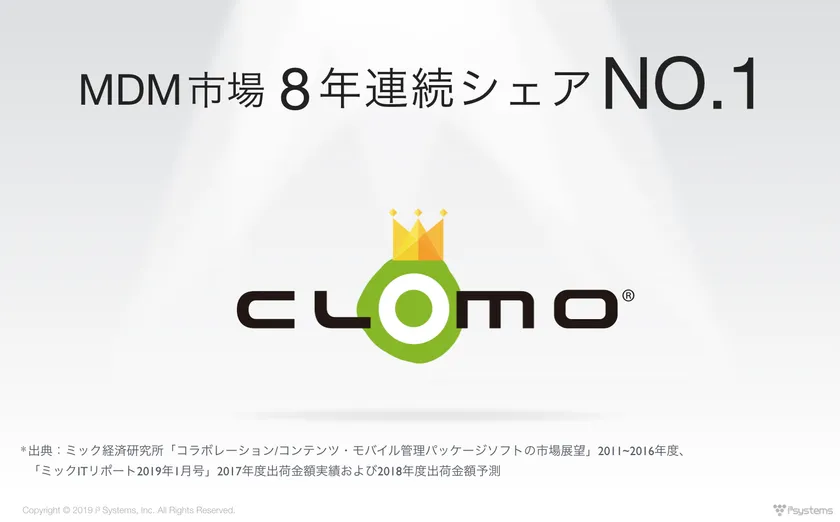この度、2019年1月に発行された「ミック経済研究所・ミックITリポート2019年1月号」によると、CLOMO MDMは、2011~2018年度のMDM市場において8年連続シェアNo.1となりました。